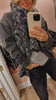 32% Alpaca, 32% Wool, 30% Nylon, 6% Spandex, in Grey with Black.