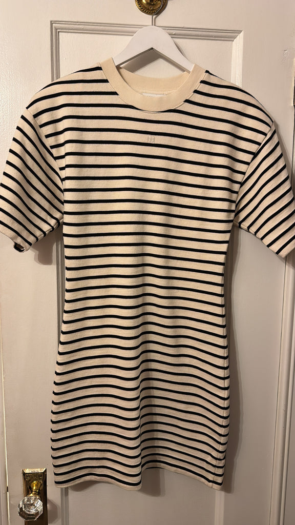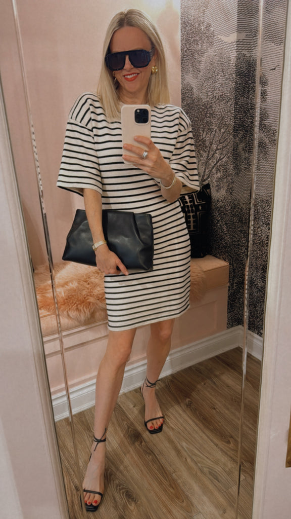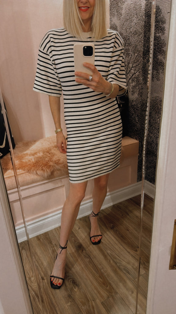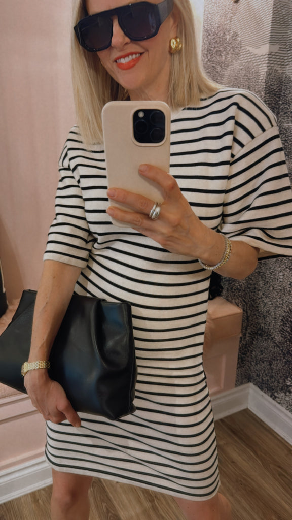 The Mona Dress is made from a midweight cotton French terry fabrication with black and white Breton stripes.