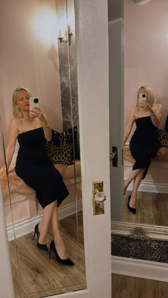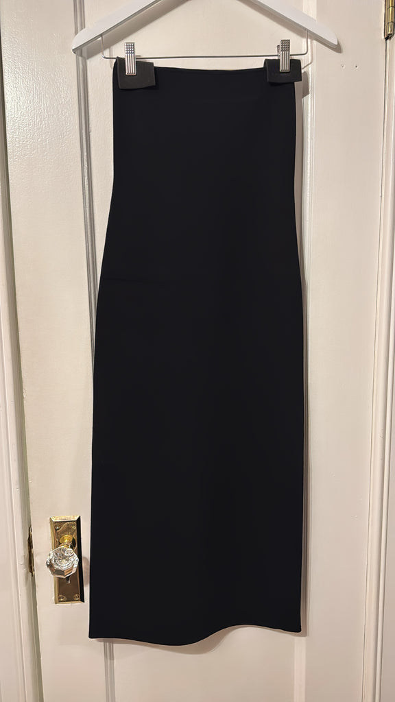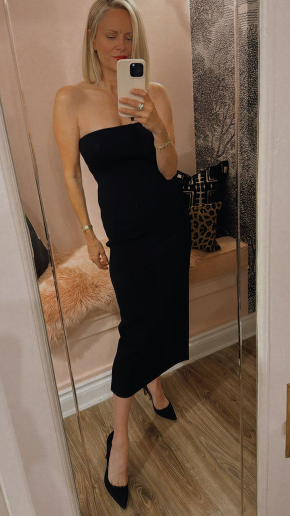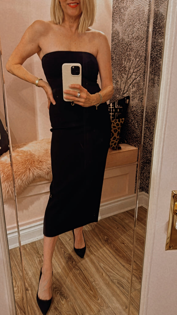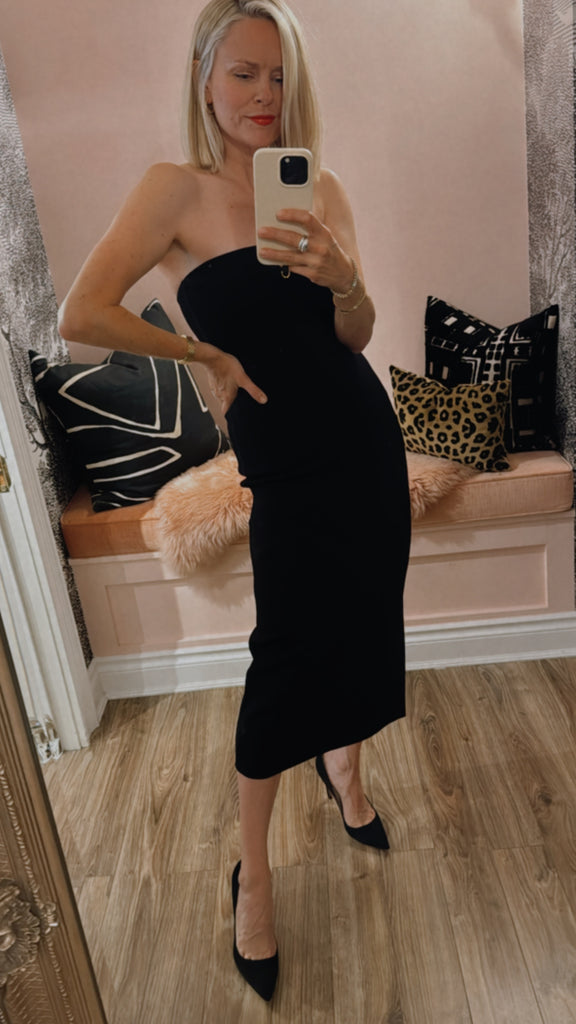 The Rosa Dress is a flattering, strapless dress made from a dense viscose-nylon knit fabrication.
