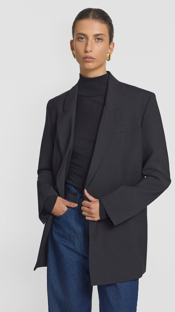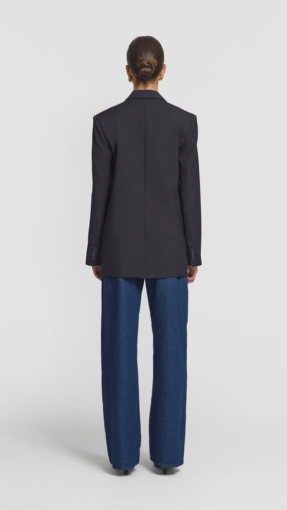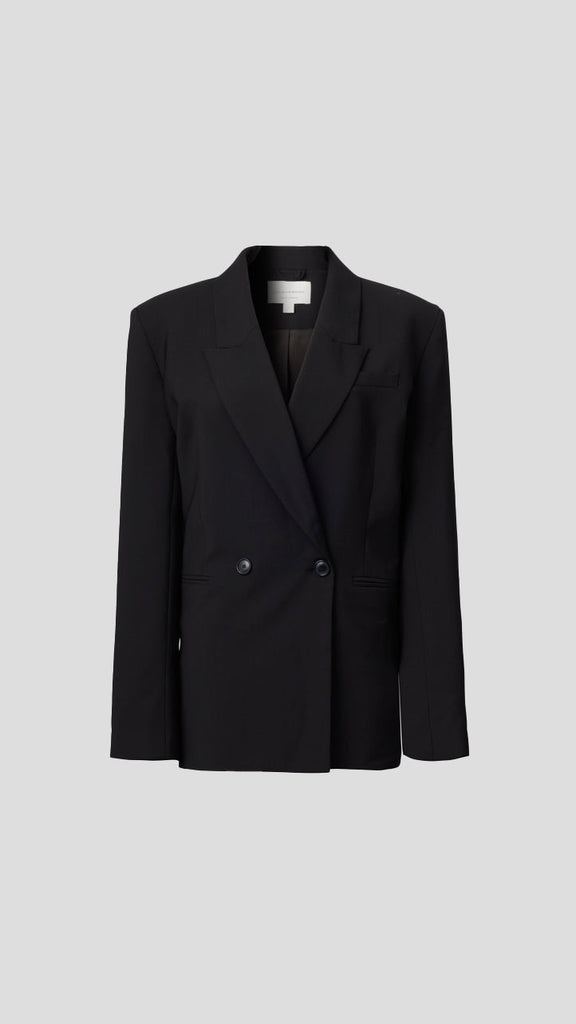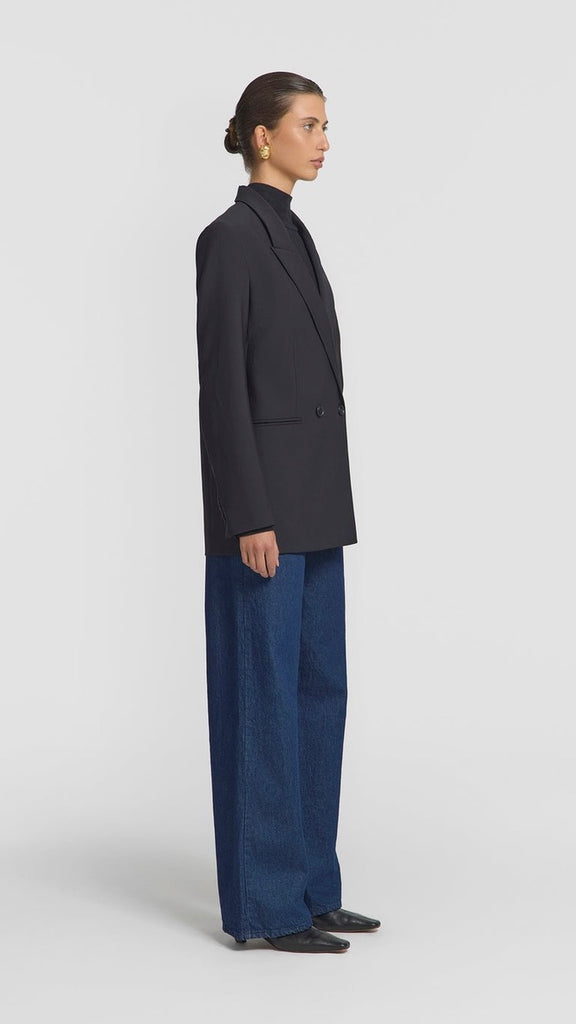 Invigorate your core wardrobe with the Collective Blazer, a modern elevation of  the classic black blazer. Crafted from 100% wool, this double-breasted silhouette boasts a peak lapel, chest pocket, and welt pockets for timeless sophistication.