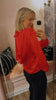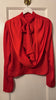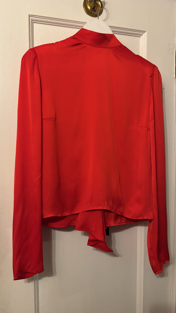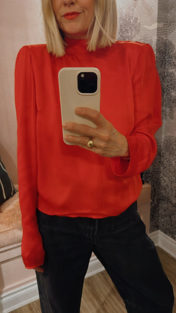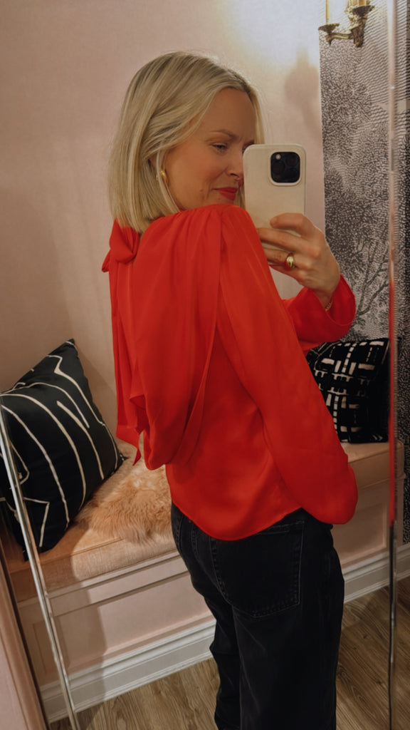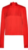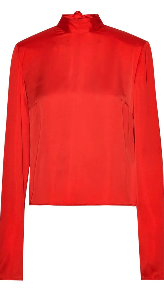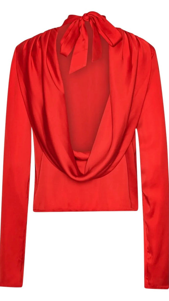 Satin Drapy Back Top is designed with a high neck and a fully open back with a wide drape detail. The back neckline is tied with a slim bow. The blouse has long sleeves and a straight fit.
