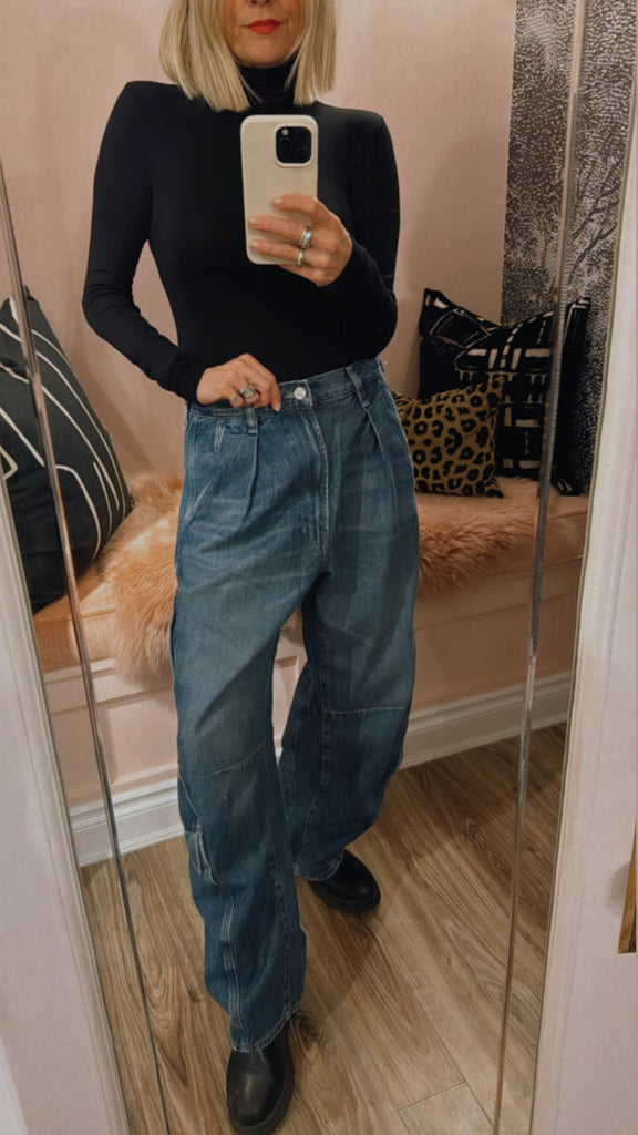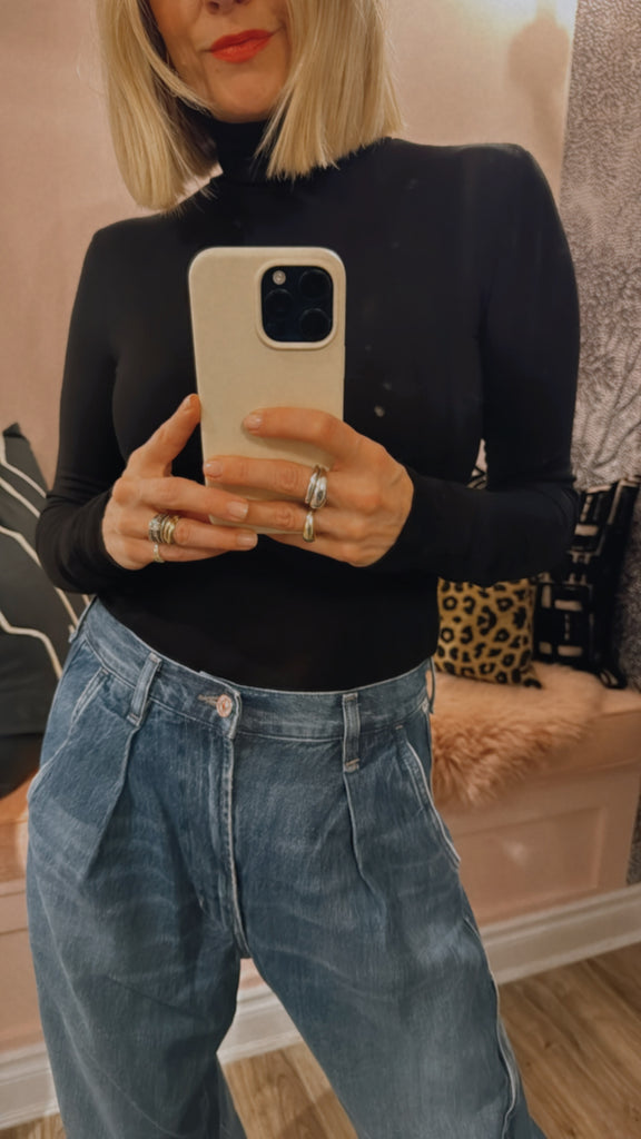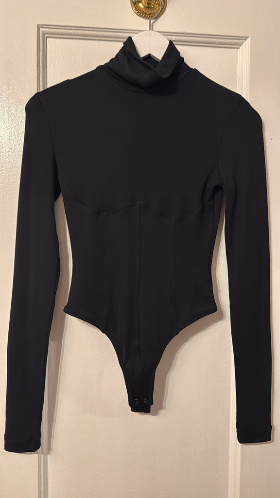 High neck bodysuit with corseted seaming through the waist, and made of a super soft jersey fabric.