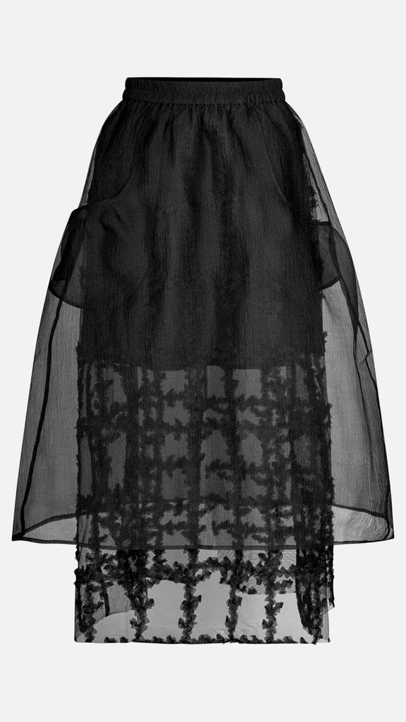 The Sevara Skirt is a layered piece made in sheer organza. The sheer design is made of three layers with a slightly structured outer layer over a longer middle layer with flower petals – Giving a modern texture on texture look for volume. A soft lining offers coverage, while the relaxed fit and elasticated waistband ensure a comfortable yet stylish fit.