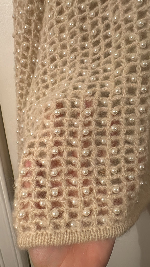With its opaque wool mix knitted in a squared cut-out pattern and decorated with delicate faux pearls, the Amil sweater makes a lasting impression. The distinctive design creates a versatile layer to be worn across seasons.