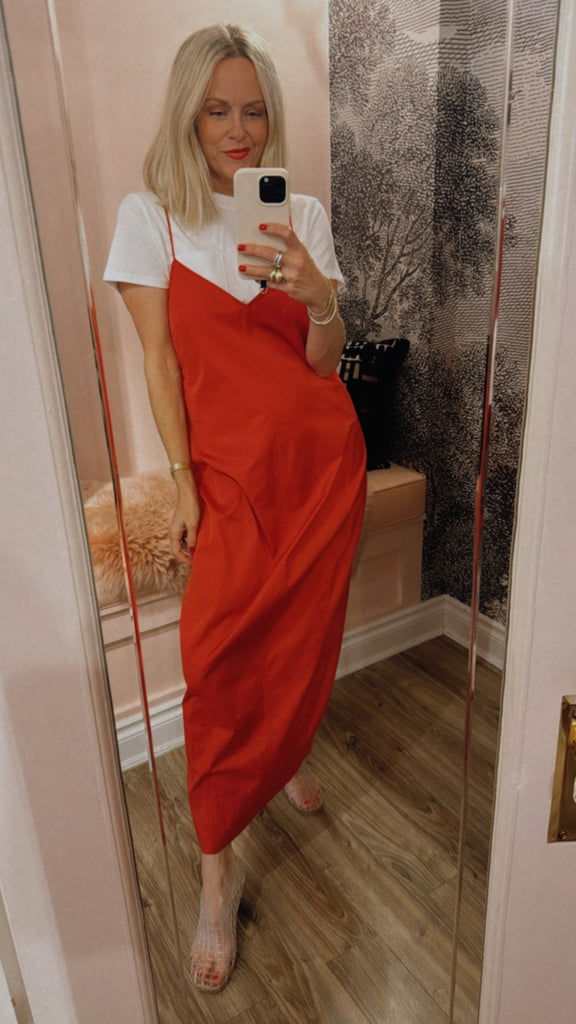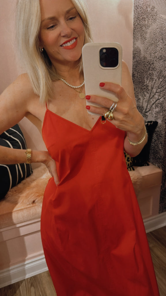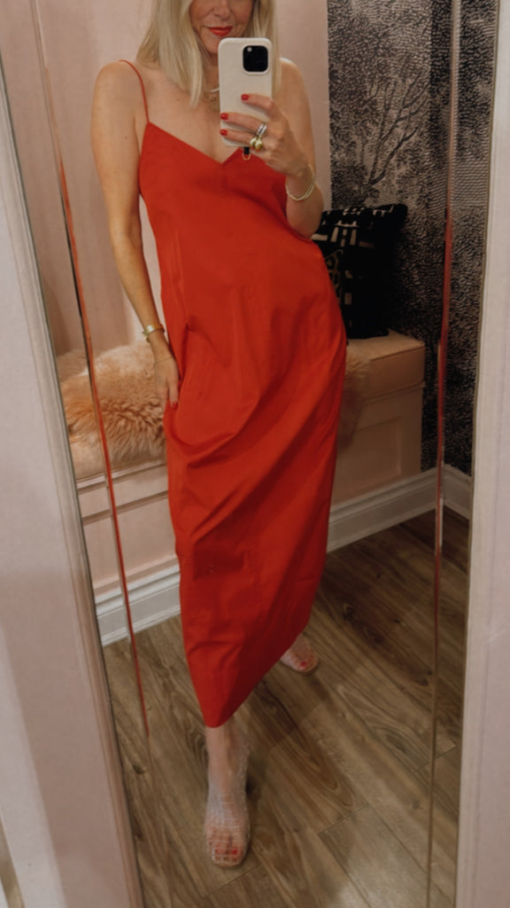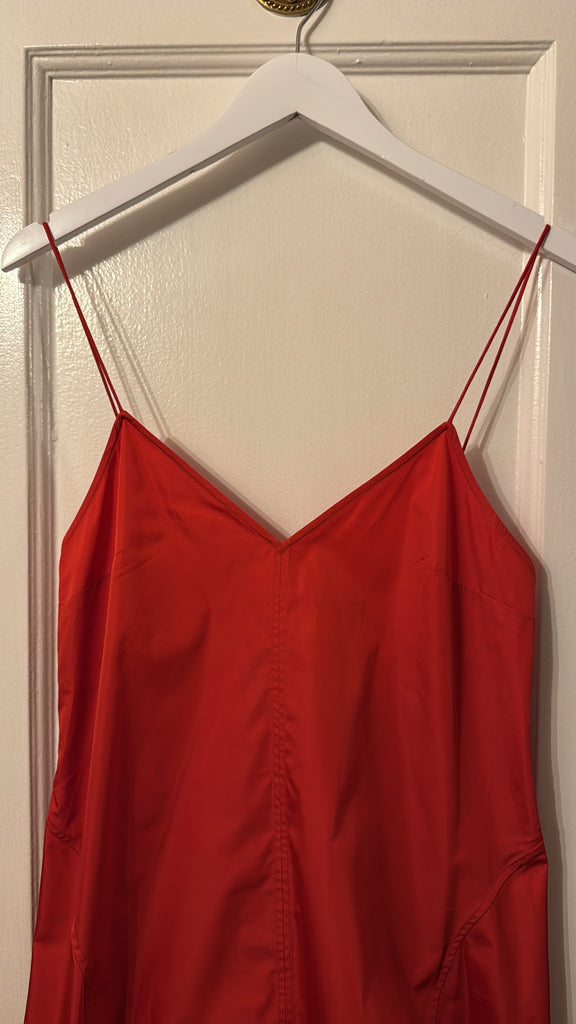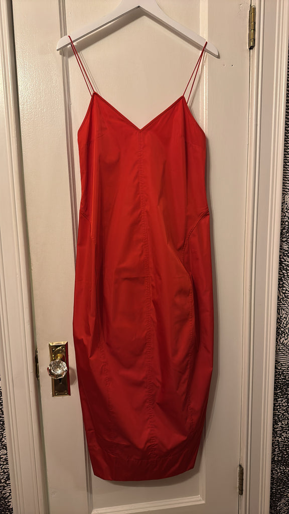 The Paper Taffeta Cocoon Dress delivers an understated yet sculptural profile. Its 7/8 length is balanced by a deep V-neckline, rouleau straps, and curved seam detailing. The Paper Taffeta Cocoon Dress offers a fluid silhouette that feels refined and contemporary.