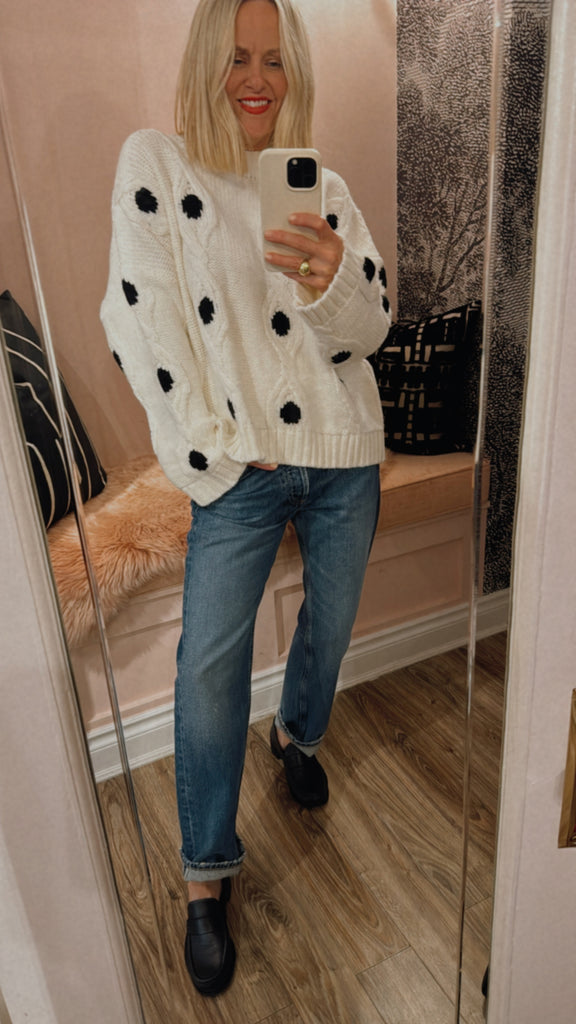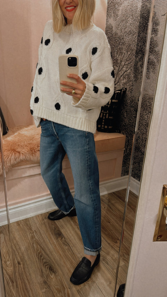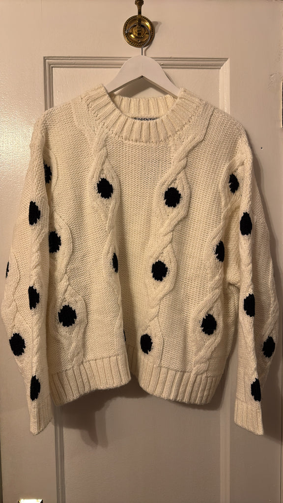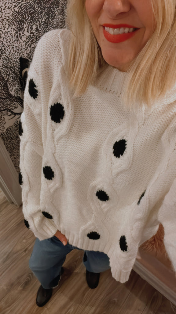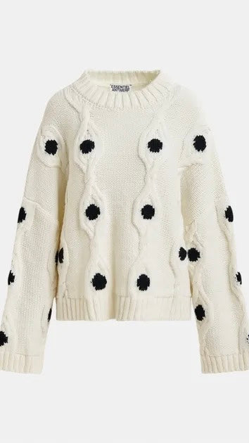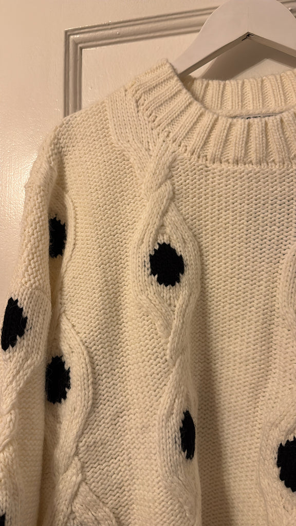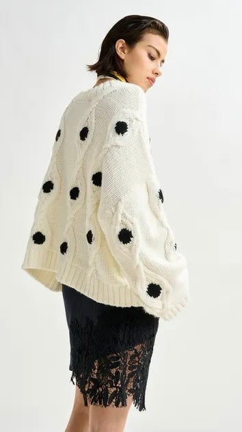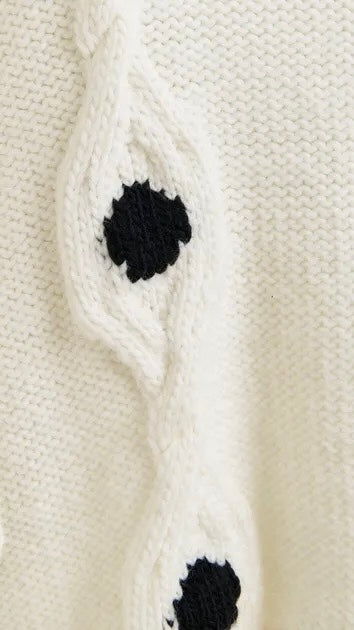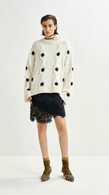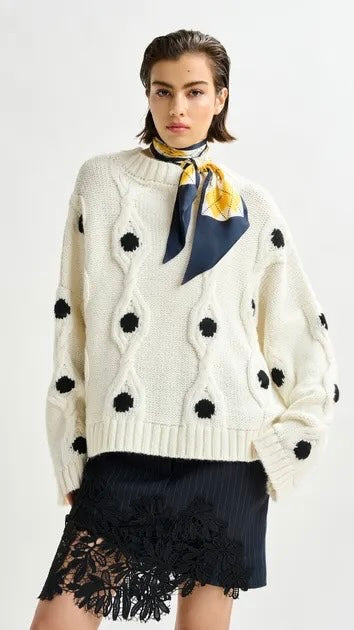 Sweater features cable stitches paired with graphic intarsia polka dots. Crafted from a wool-blend, it’s spun into a midweight knit that provides both warmth and structure. The slightly boxy fit and dropped shoulders lend a nonchalant elegance, enhanced by ribbed trims for a clean finish. Made in Portugal, it’s an effortlessly stylish layering piece for cooler days.