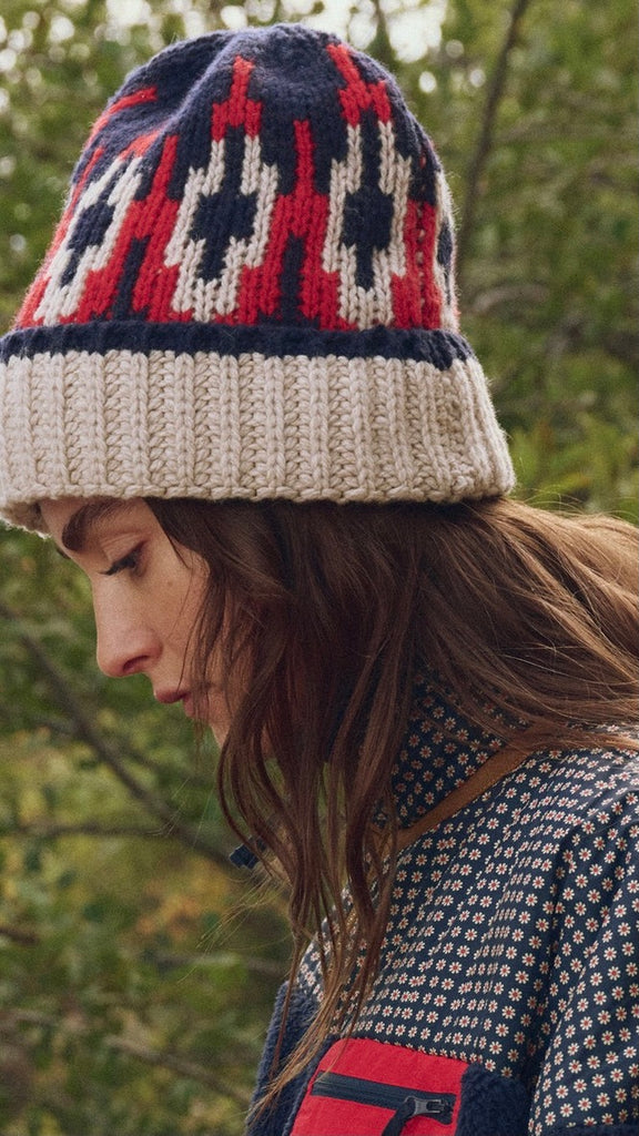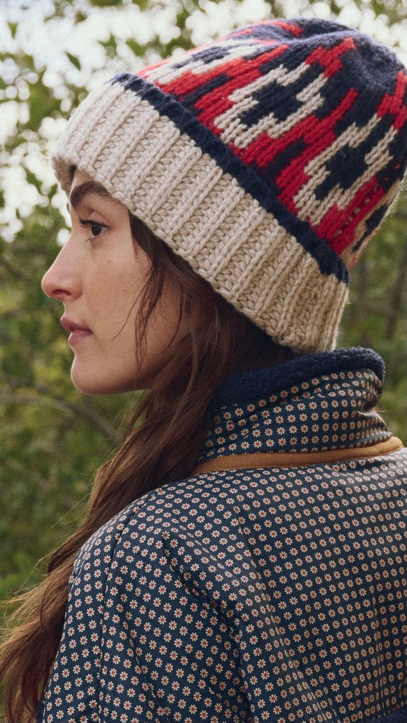 The Nordic Beanie is knit from a chunky wool rich yarn into a classic fair isle motif.