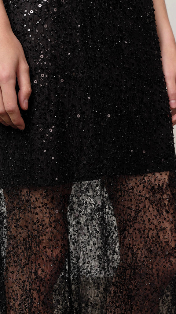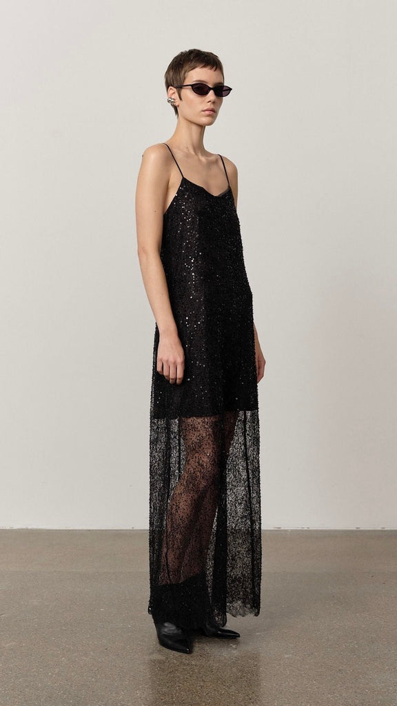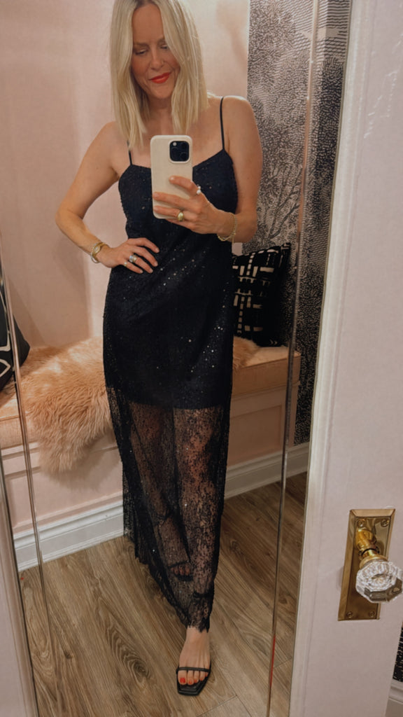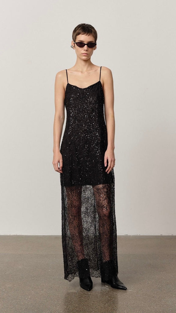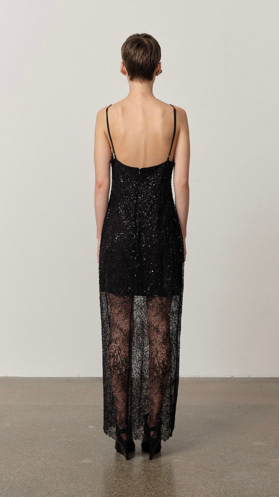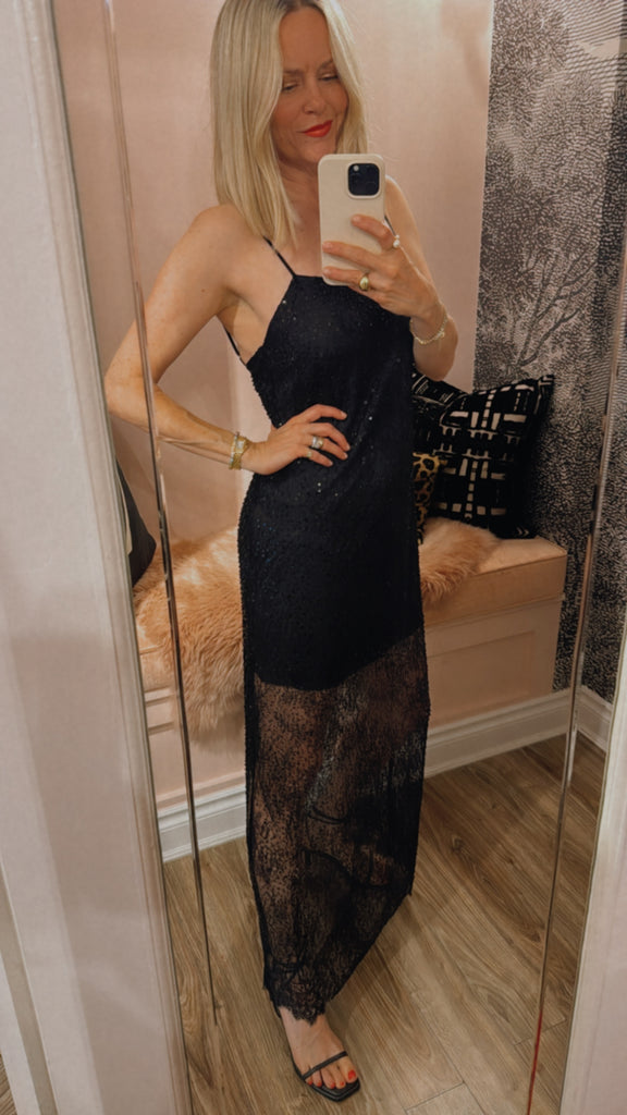 Half-lined lace maxi dress adorned with beads and sequins, and finished with delicate satin spaghetti straps.