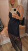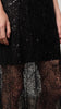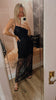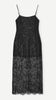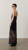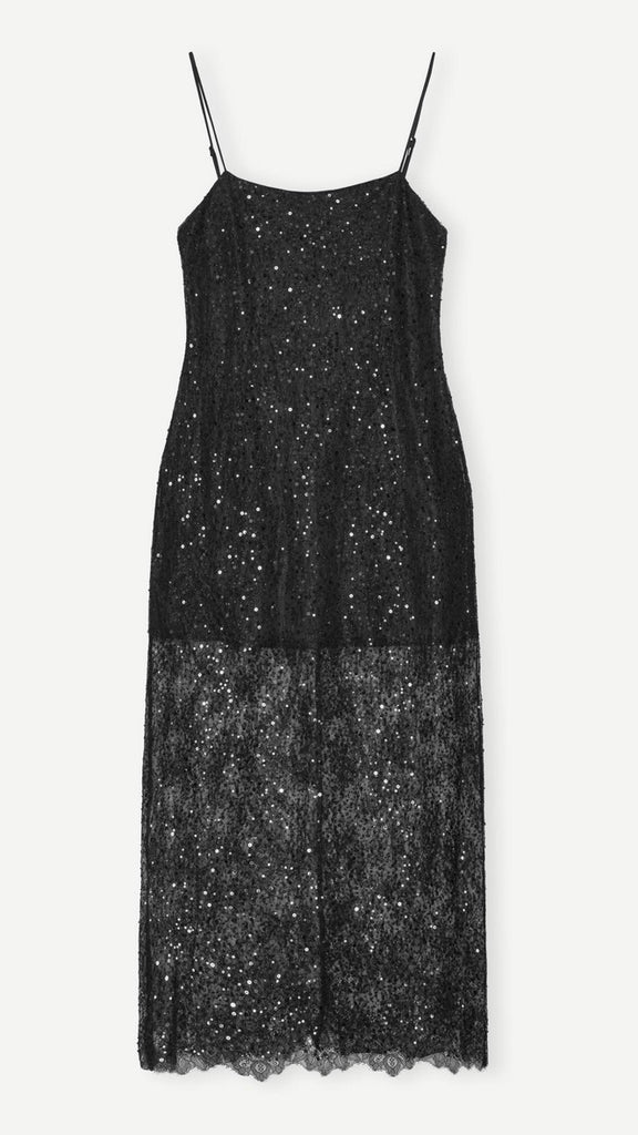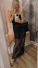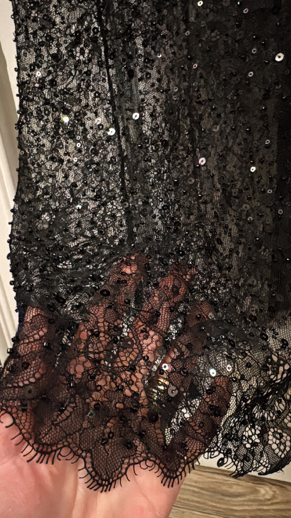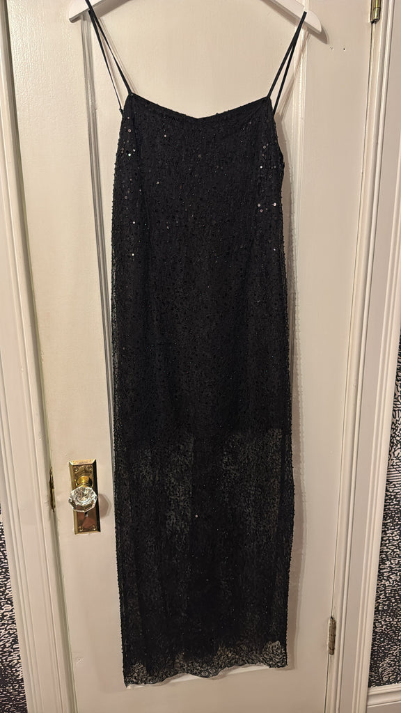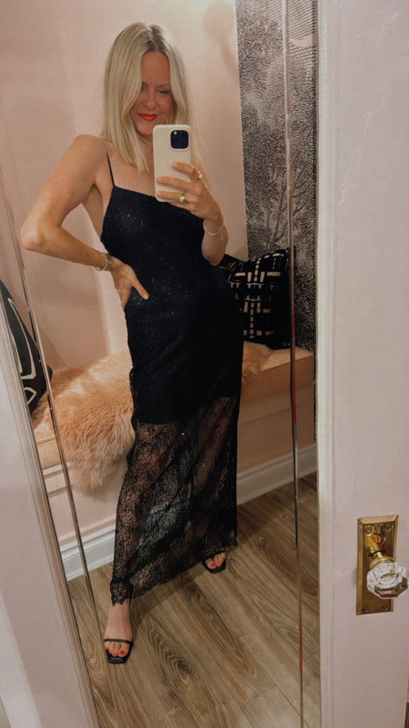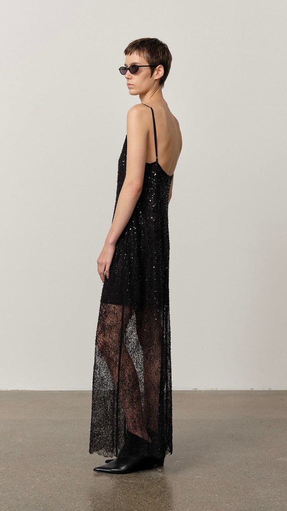 Half-lined lace maxi dress adorned with beads and sequins, and finished with delicate satin spaghetti straps.