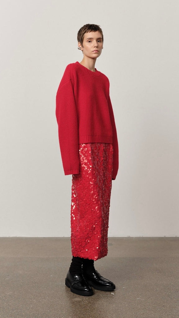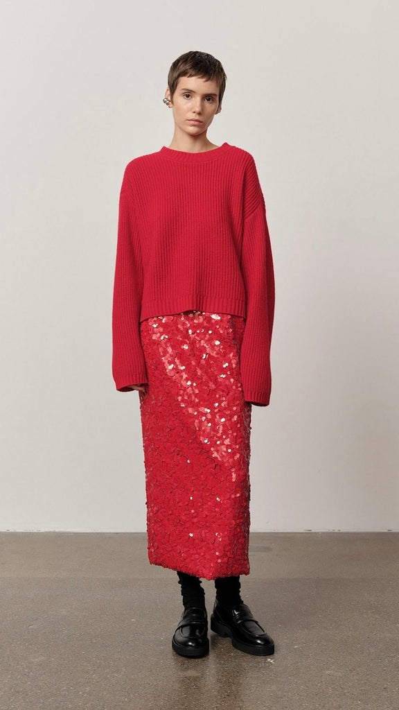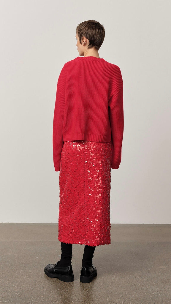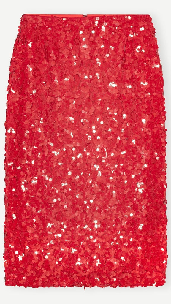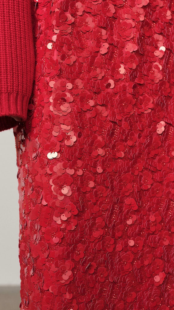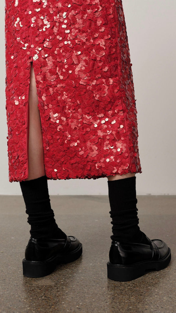 The Anda Midi Skirt is a heavy lined skirt encrusted with sequins and beads.