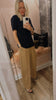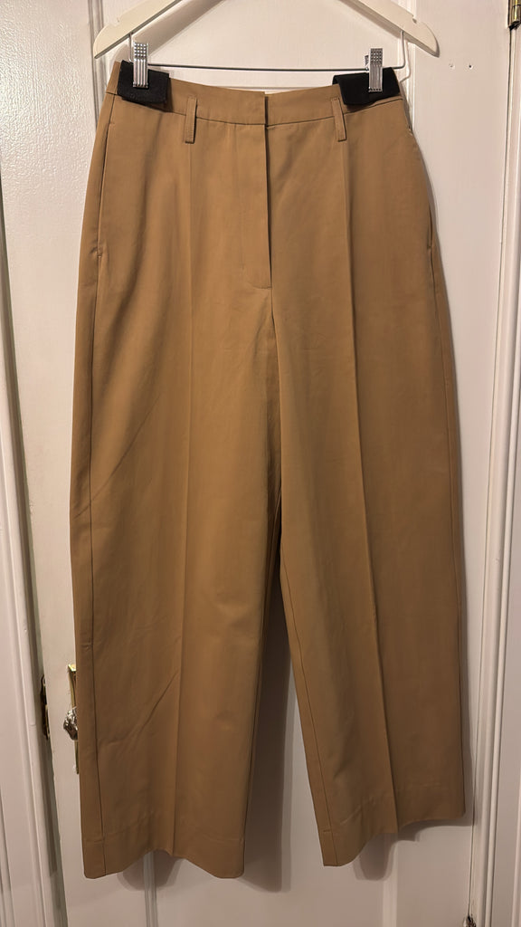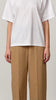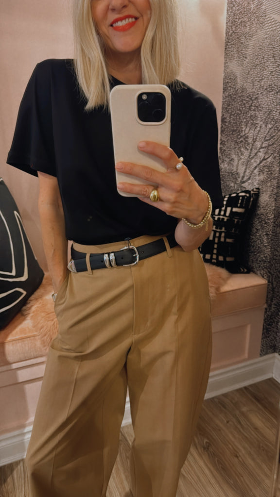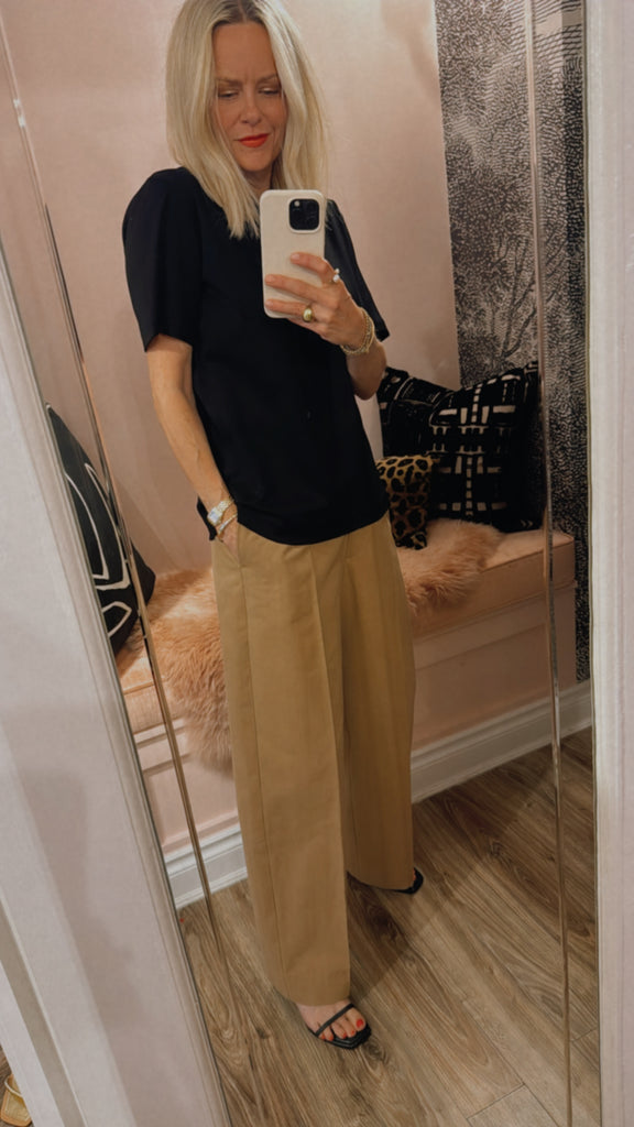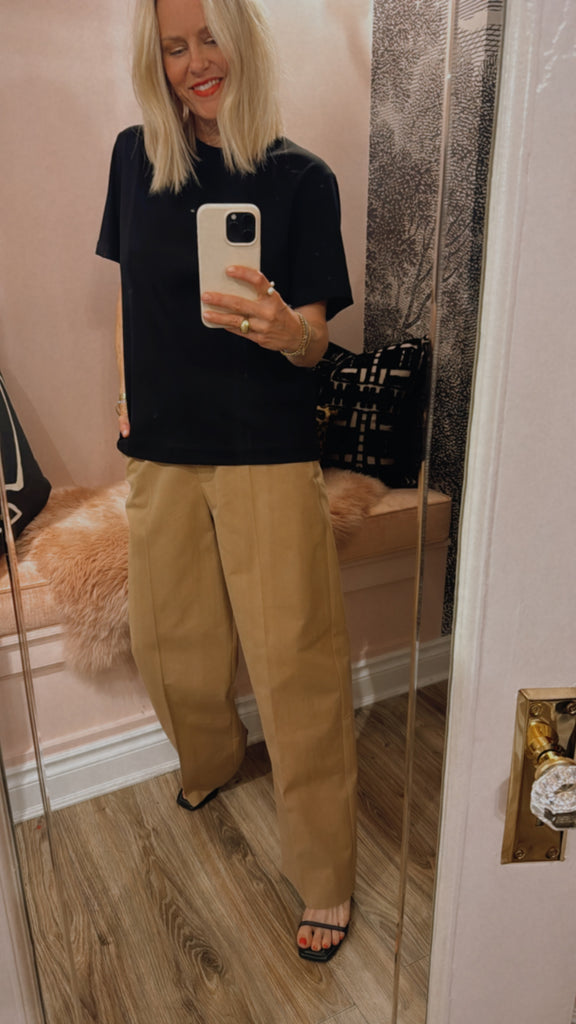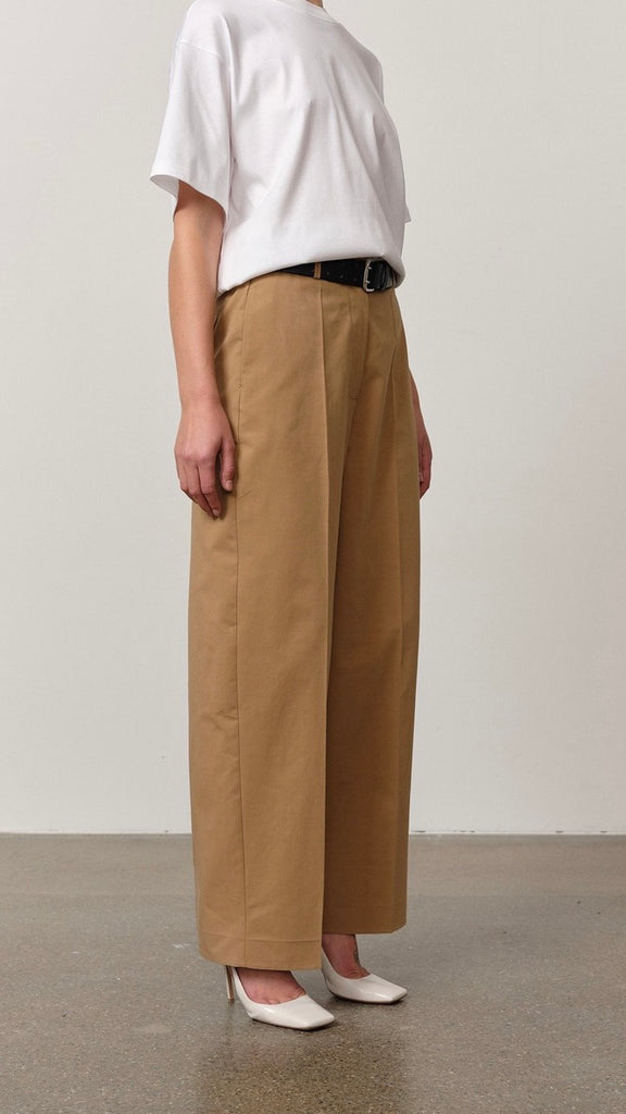 The Olly pant is made of a crisp cool mid weight cotton poplin and features a voluminous slightly barrelled leg.