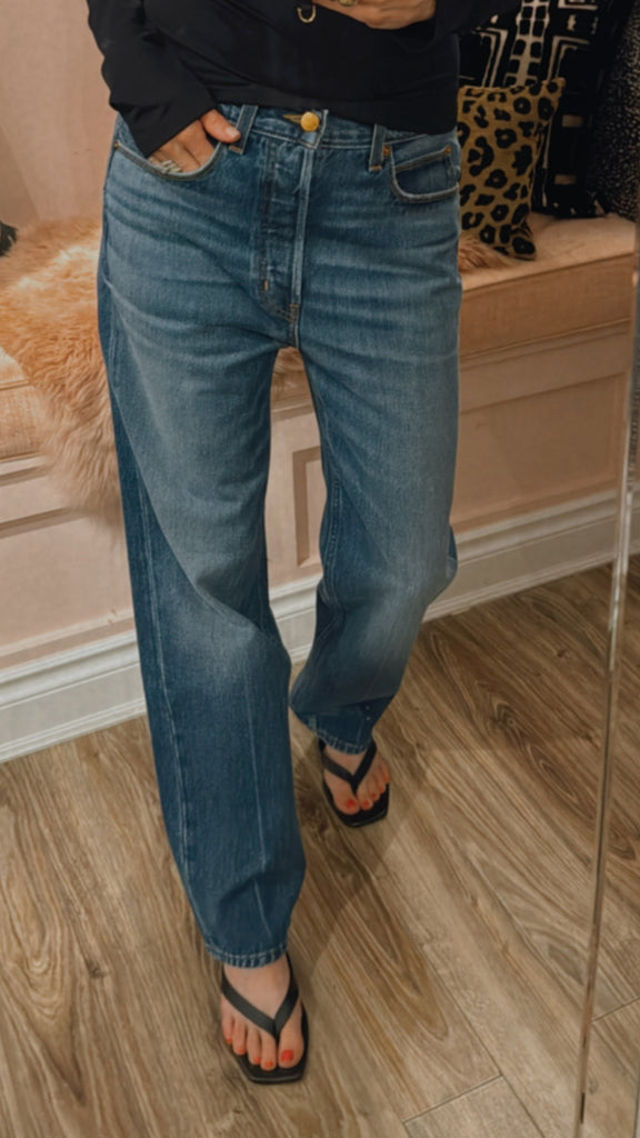 A slouched mid rise relaxed ankle fit. A looser fit that perfects a slung slouch and falls from the hip with ease. Jamie prefers them with a knuckle deep single cuff worn back to the loafer. They are the perfect loafer jean. A classic shaped, relaxed jean to show off your loafers.