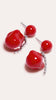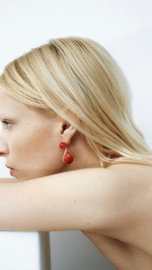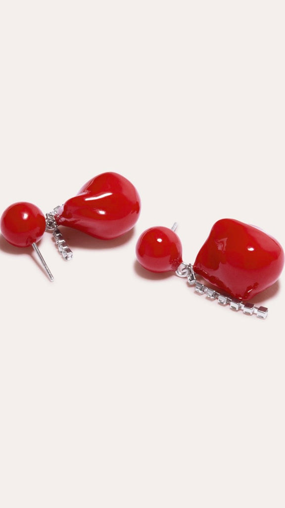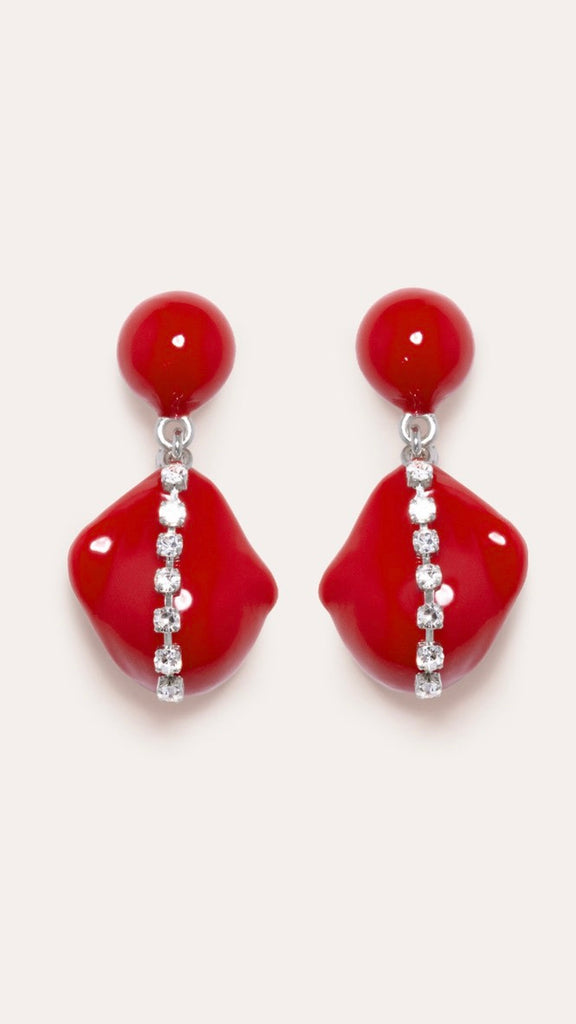 Crafted in red resin and accented with a descending line of cubic zirconia, each stone traces a precise path through the earrings’ sculptural folds.