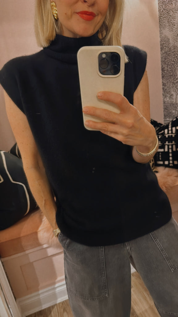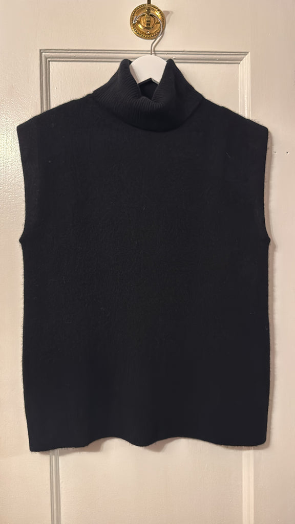 The Brushed Cashmere Vest is a relaxed fit vest, crafted from a cashmere blend. This cosy layering piece has a brushed texture with a luxuriously soft hand feel. It features a ribbed high neck and hemline.