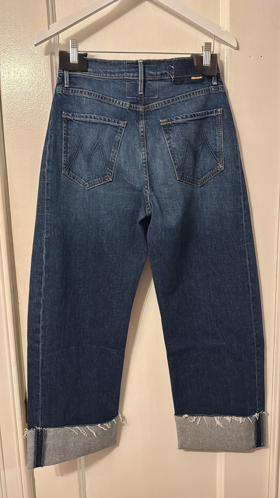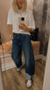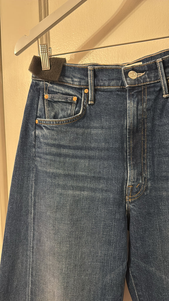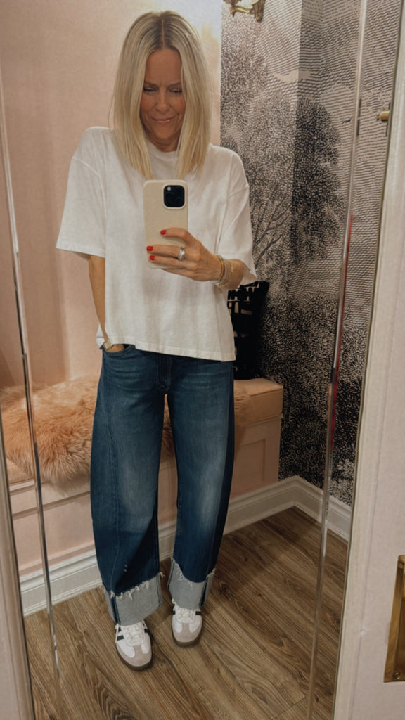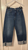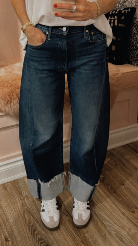 A super high-waisted barrel jean with a zip fly, wide, curved leg and an ankle-length inseam with a cuffed, frayed hem. Made from semi-rigid SUPERIOR denim, Perfectly Imperfect is a dark blue with whiskering and fading at the knees.