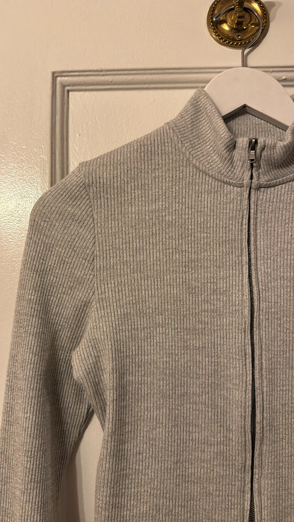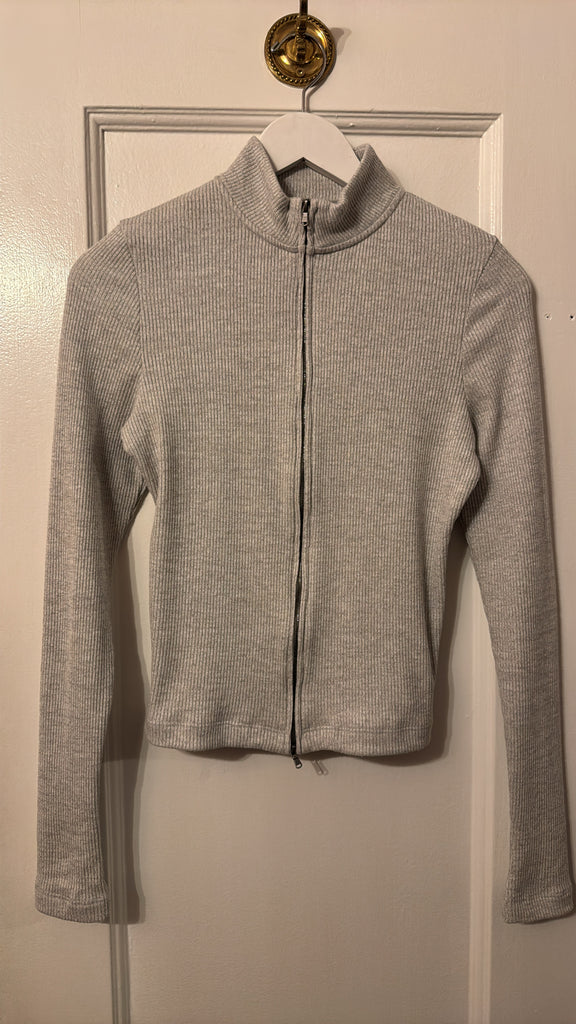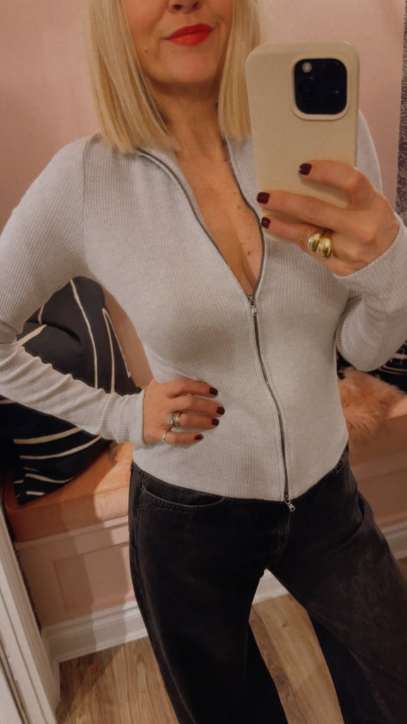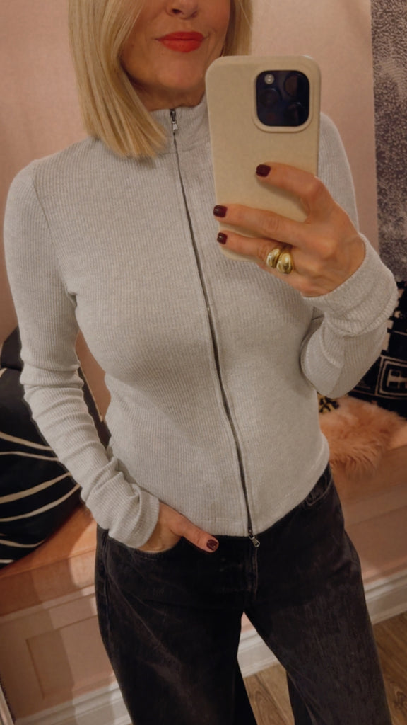 The Zip Cardigan is crafted from super soft sweater rib with the perfect amount of stretch. The light heathered grey silhouette features a fitted long sleeve design with a full zip front, offering a clean, polished look. Perfect layered over tees or worn alone with tailored pants for versatile styling.