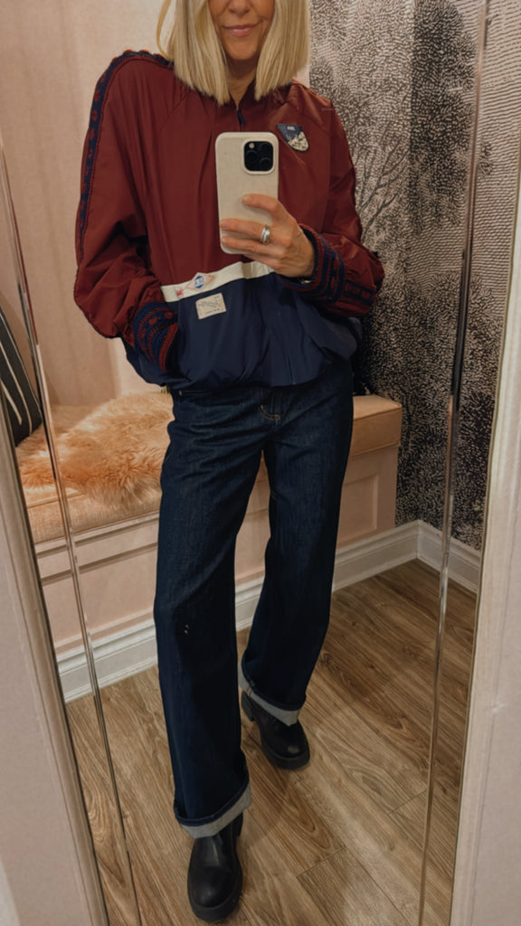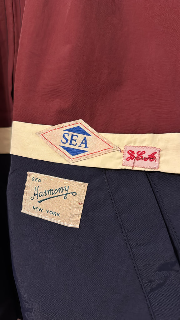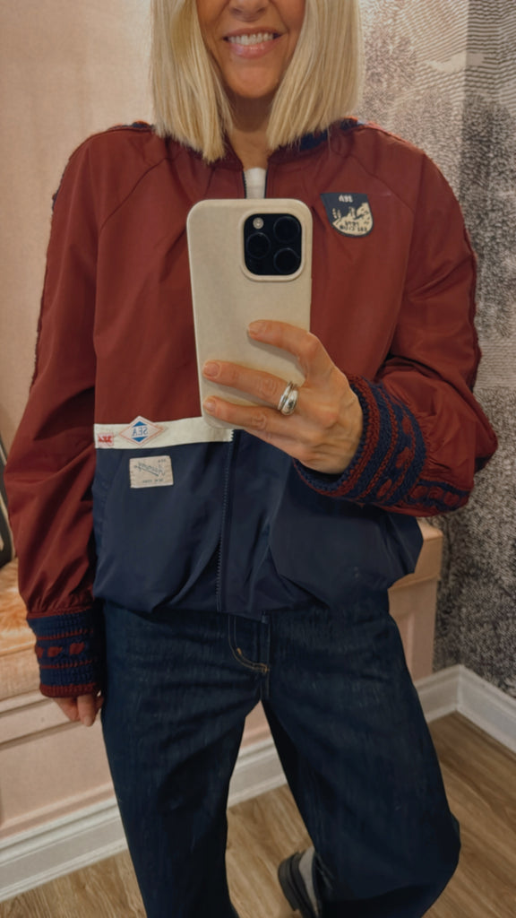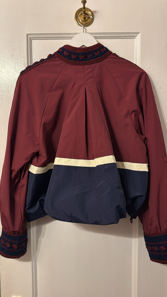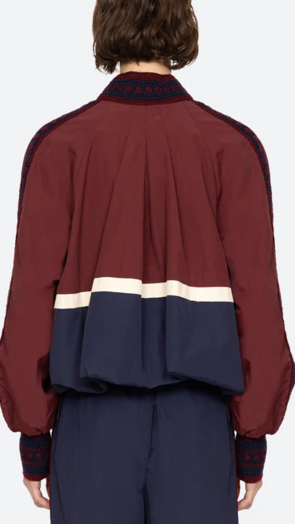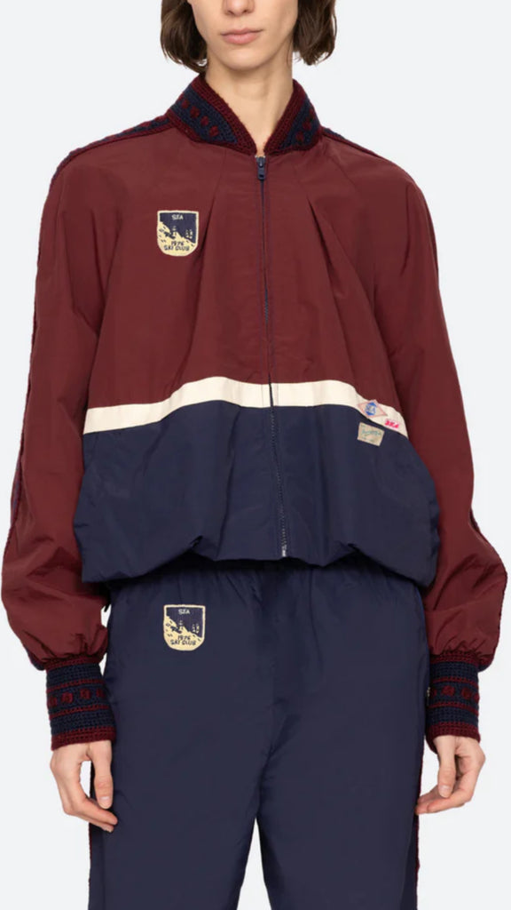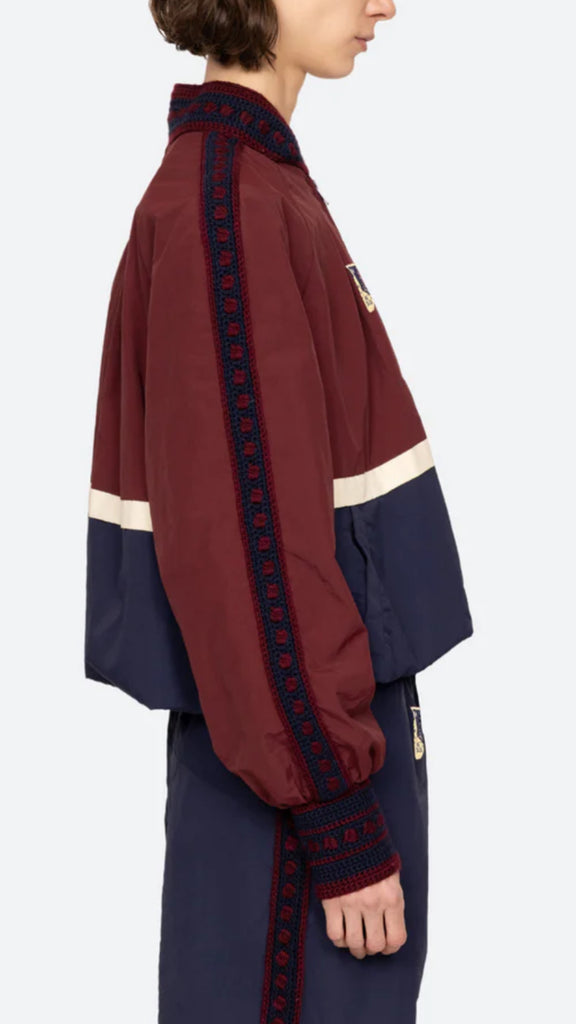 The Mira windbreaker jacket combines bold color blocking with detailed crochet trim, finished with custom 'Sea' labels and signature patches. Designed to pair effortlessly with the Mira windbreaker pants.