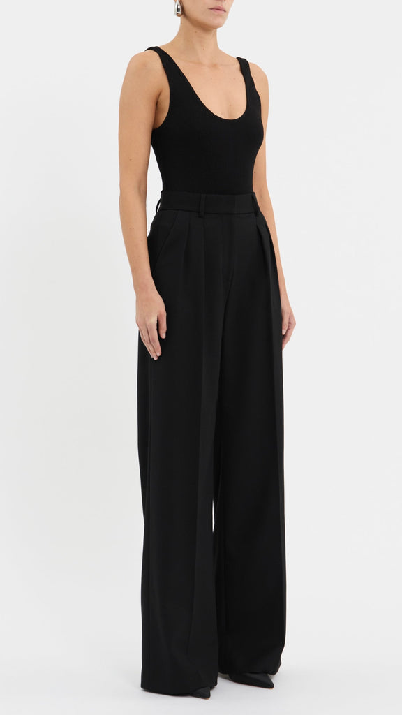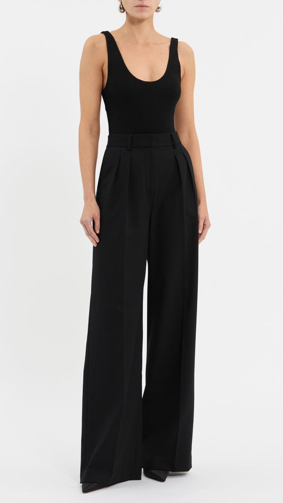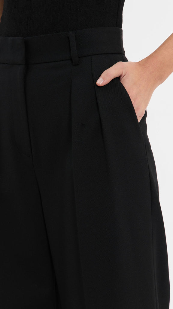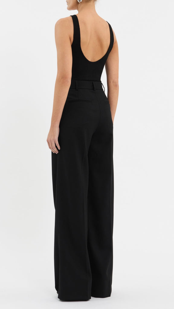 The Finley Pant in black epitomises sophisticated suiting. Featuring a tailored wide leg silhouette, the pressed creases and high waistband detailed with belt loops shape a sleek and flattering figure. Side seam pockets and jet pockets at the back provide functional elegance, while a fly front zip fastening ensures ease of wear. Timeless and versatile, these pants pair effortlessly with the matching Finley Blazer.