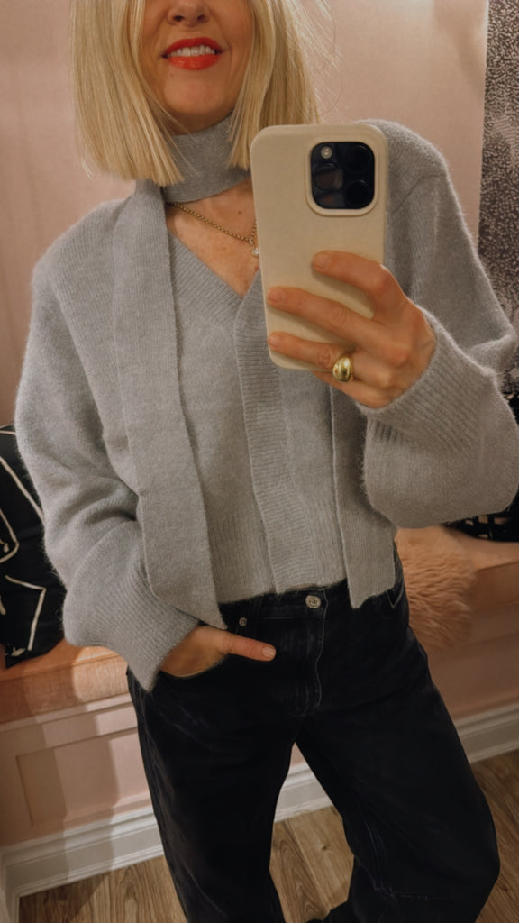 Knit Scarf Cardigan Light Grey is a slightly cropped knit cardigan with a deep V-neck, wide shoulders, and a matching removable scarf. Crafted from a soft wool and alpaca blend with ribbed hem and cuffs.
