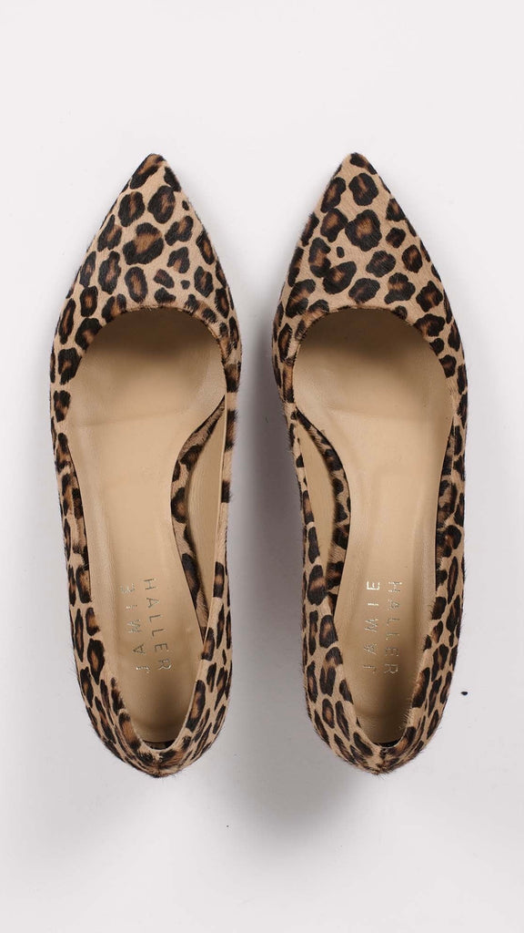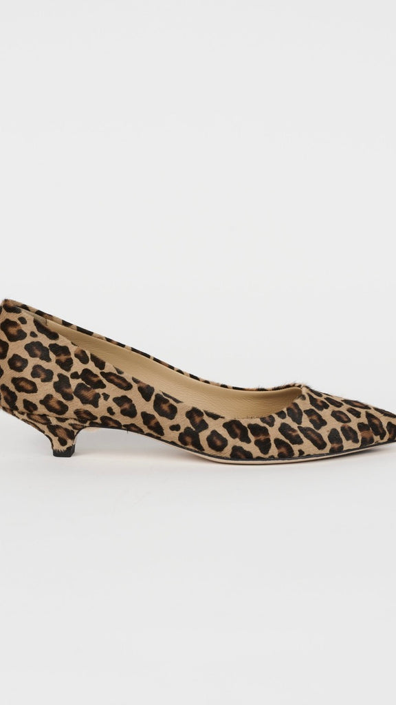 A classic kitten in a working girl shape. A soft and comfortable pump with a beautiful shaped pointed toe. Leather sole with anti slip rubber injection. Super soft calfskin with hair, dyed in a leopard print.