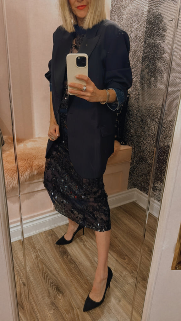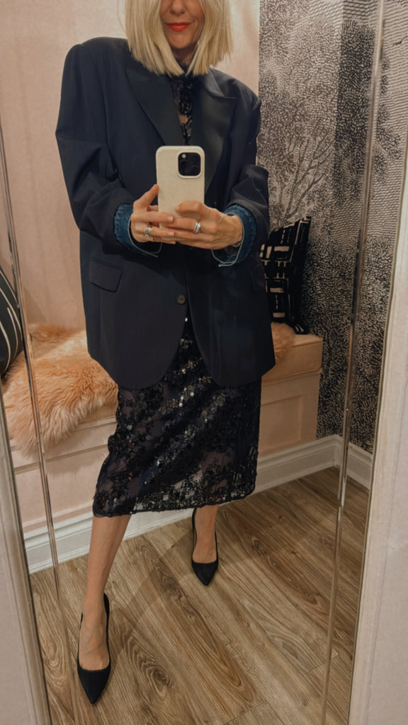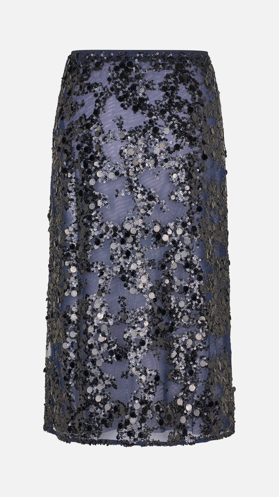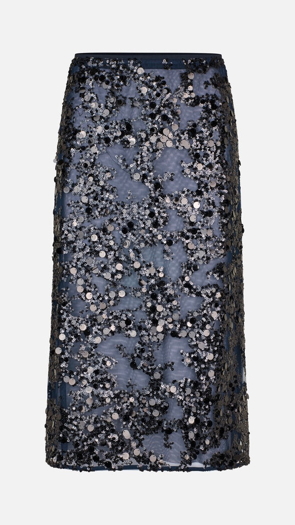 The Shania Skirt embraces the sparkle with its eye-catching sequins design. The skirt has a high waist and midi length for an elegant yet modern silhouette. It has a mesh lining underneath the sheer sequins layer for some extra coverage. The elasticated waistband ensures a comfortable fit that can be worn high or low-waisted to suit your style. When it comes to sparkle, there are no rules. Style it however you like - Go all out in our matching sequins styles or dress it down with one of our t-shirts, shirts or knitwear.