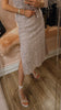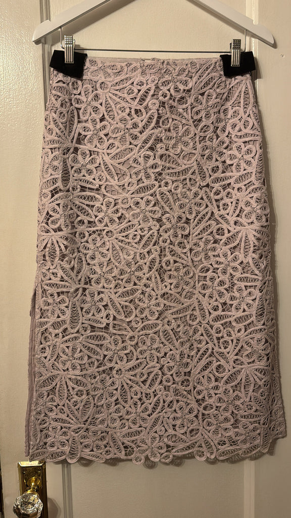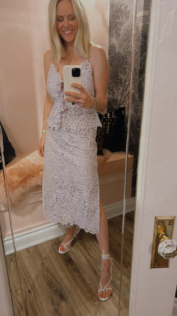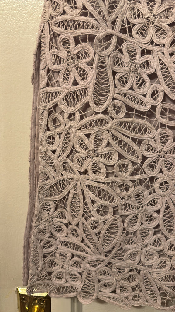 The Iyla midi skirt features soutache open work embroidery and a slit on either side.