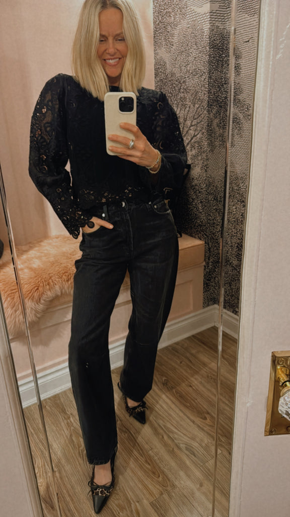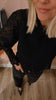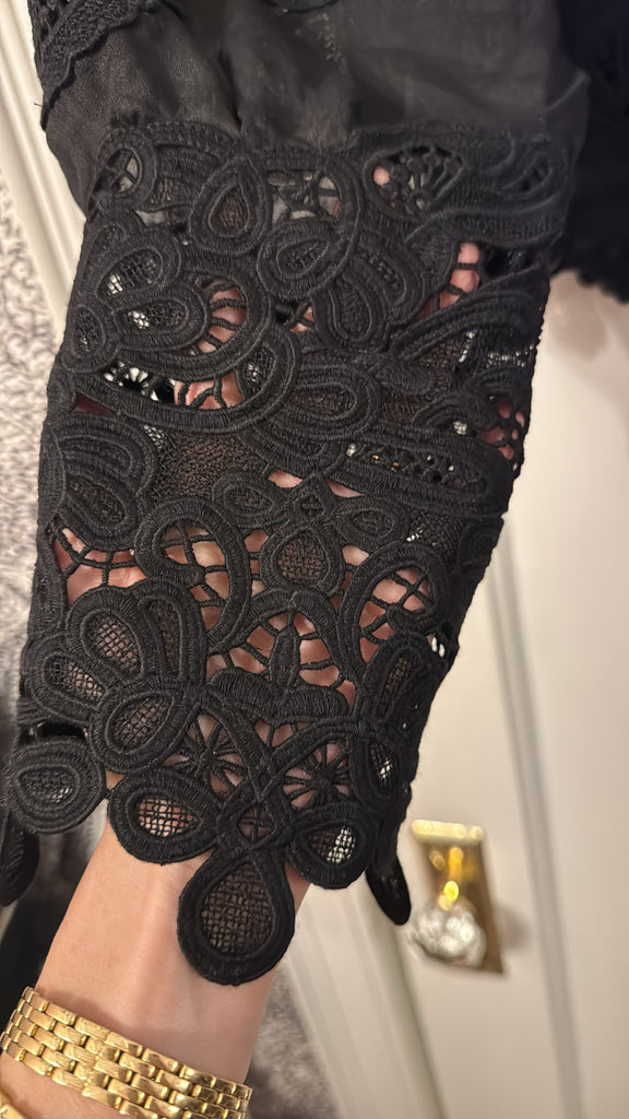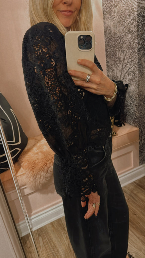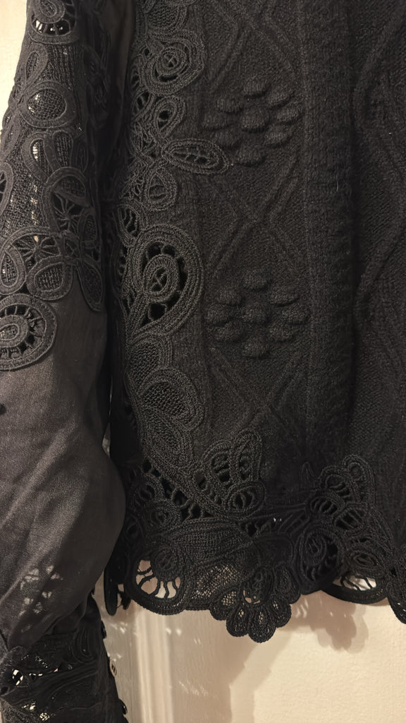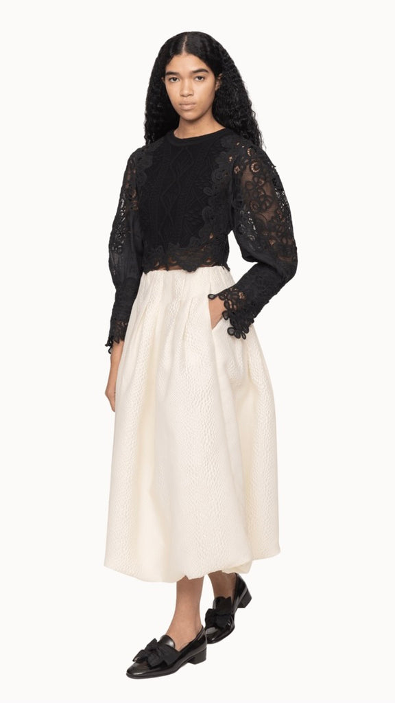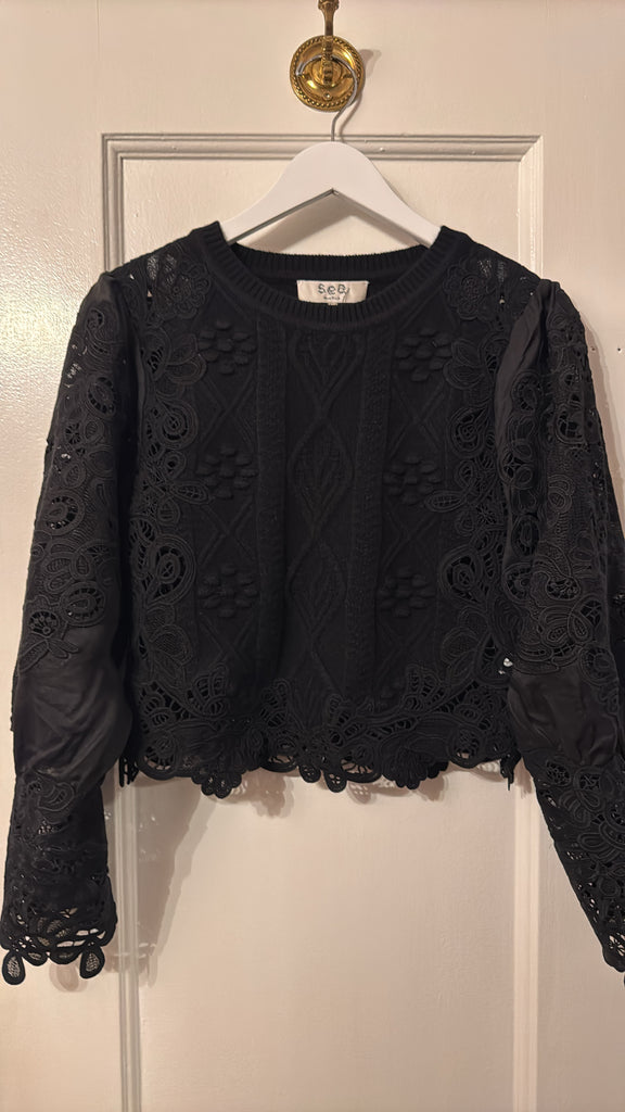 The Vania lace combo sweater blends modern elegance with vintage-charm, featuring a cable knit body framed by sheer lace sleeves. The cropped silhouette lends a contemporary finish to this polished style.