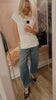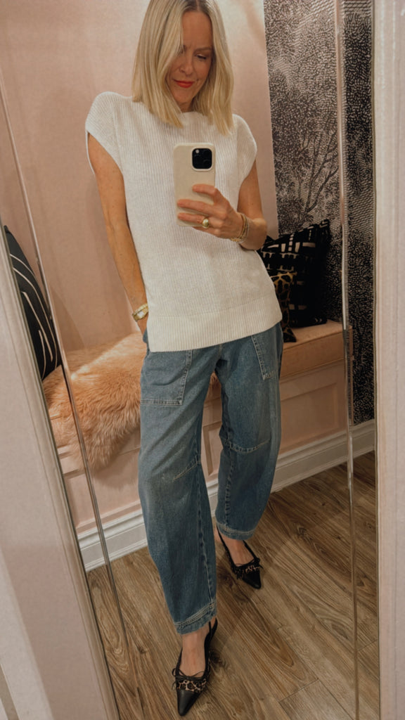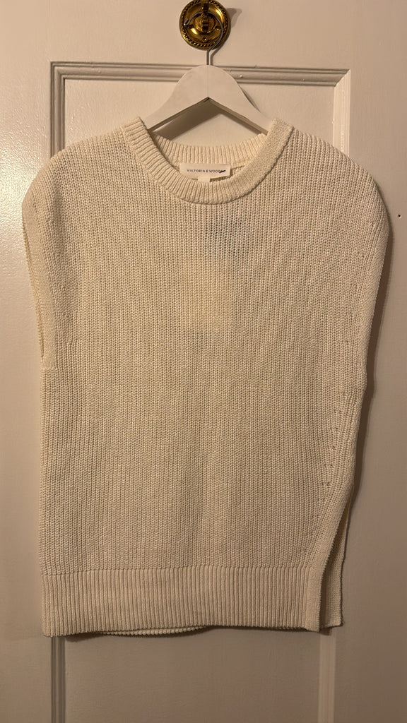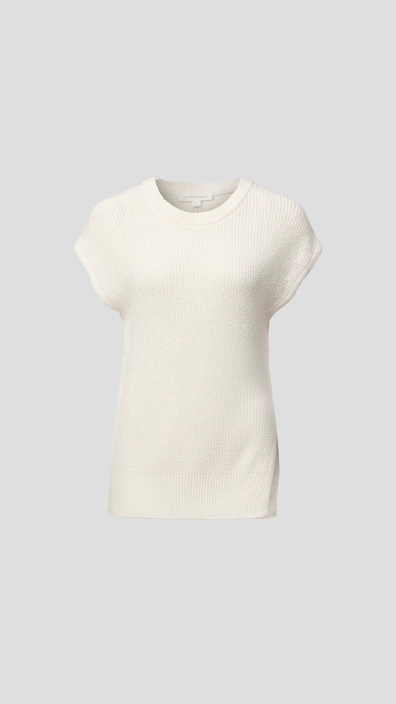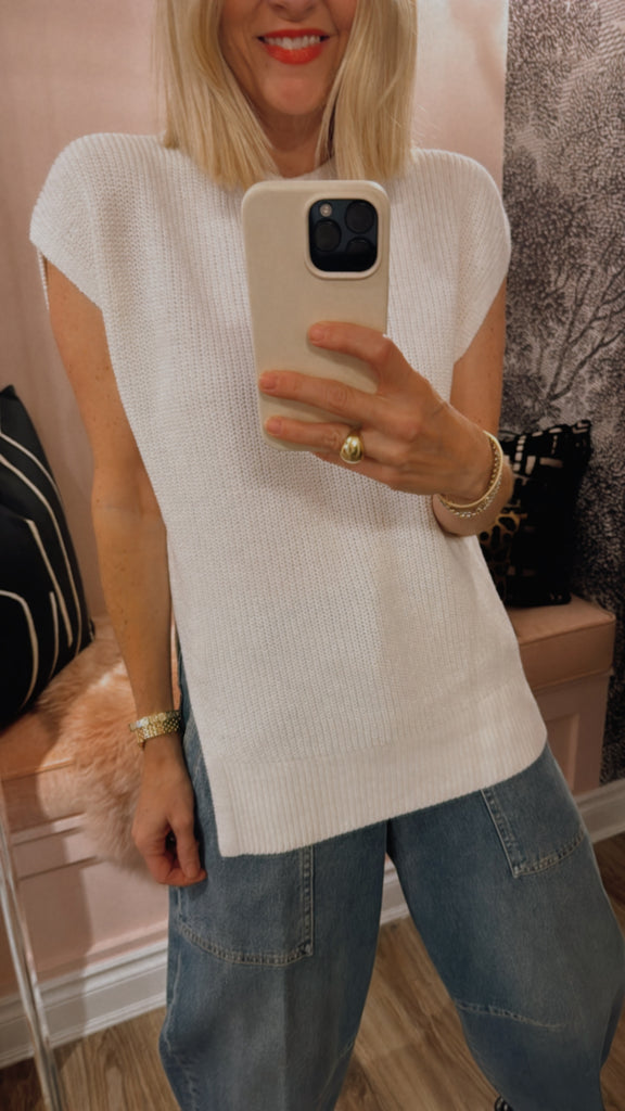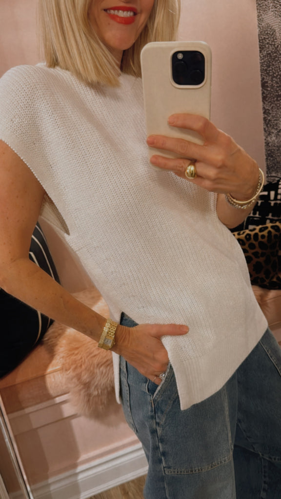 The Memphis Knit Top is crafted from a cotton-linen blend in classic ivory, inspired by coastal calm. Featuring a dimensional rib stitch, extended shoulders, and an asymmetric split that wraps around the front, it offers a simple yet refined aesthetic.