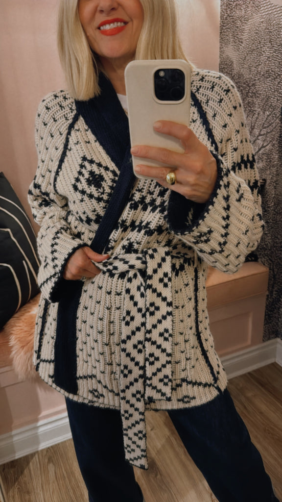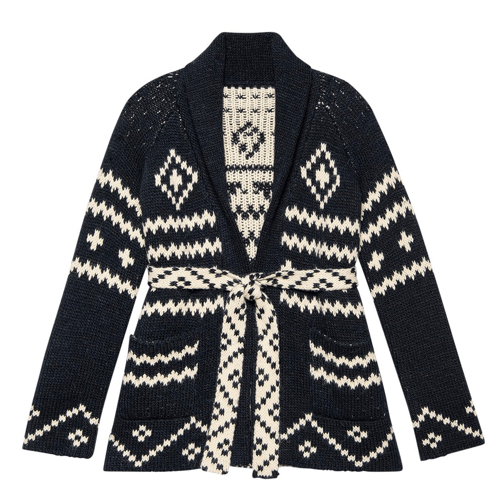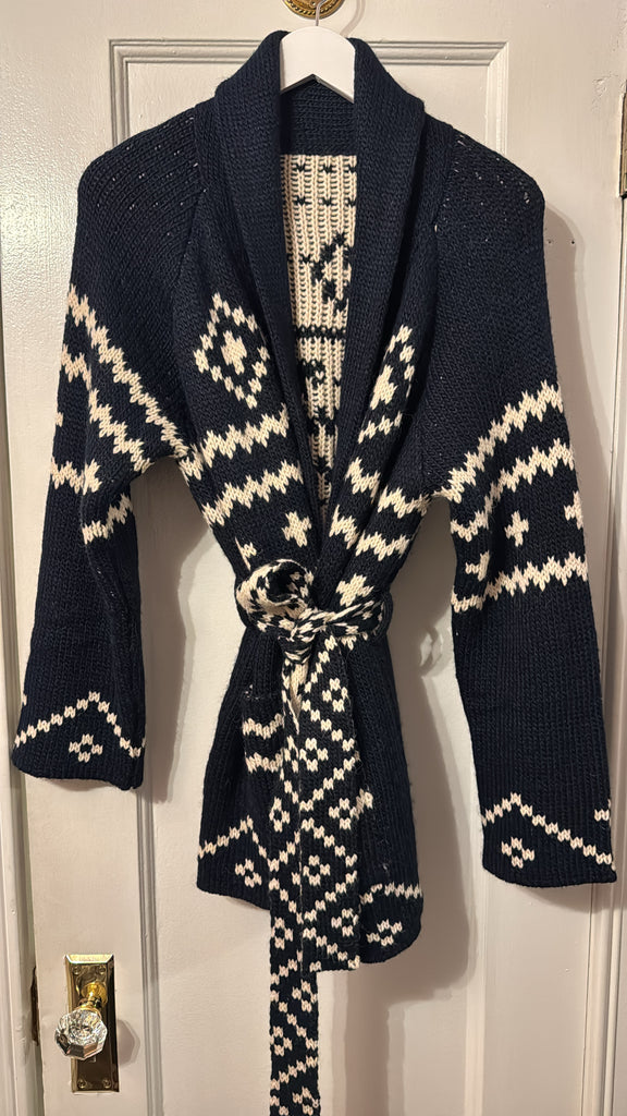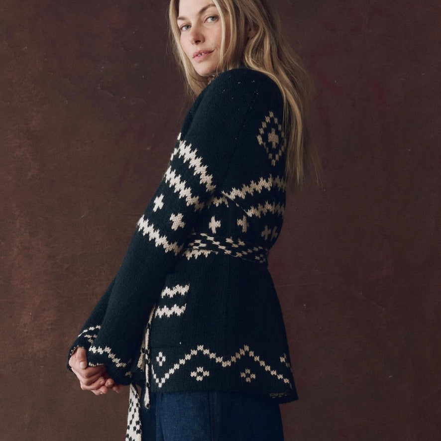 The Reversible Shepherd Cardigan is a longer-length shawl style spun from alpaca in a double jacquard technique for full reversibility. With raglan sleeves, no front closure, and a removable waist tie, it’s easy to wear two ways—on the cream side or navy side.