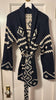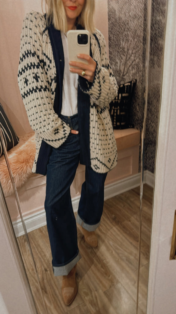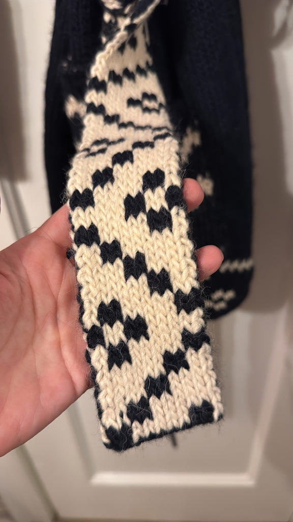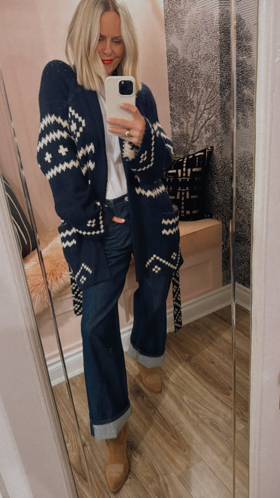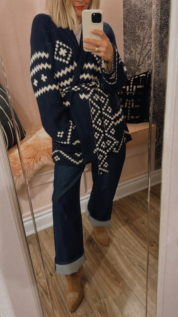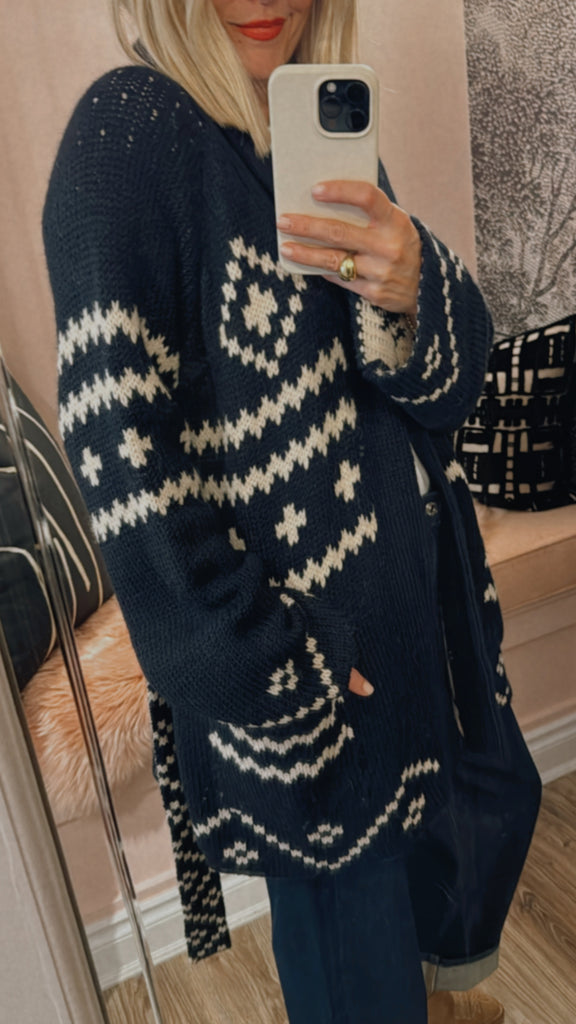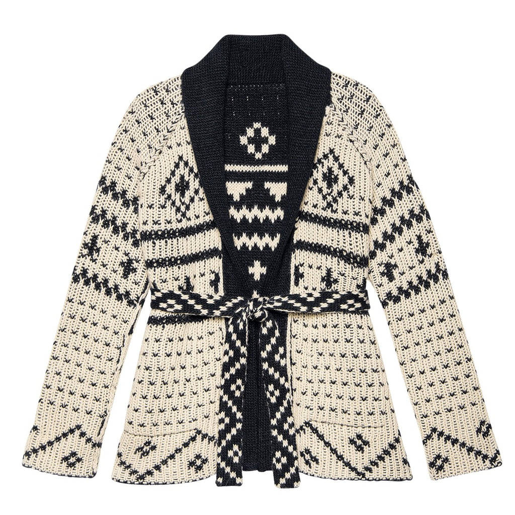 The Reversible Shepherd Cardigan is a longer-length shawl style spun from alpaca in a double jacquard technique for full reversibility. With raglan sleeves, no front closure, and a removable waist tie, it’s easy to wear two ways—on the cream side or navy side.